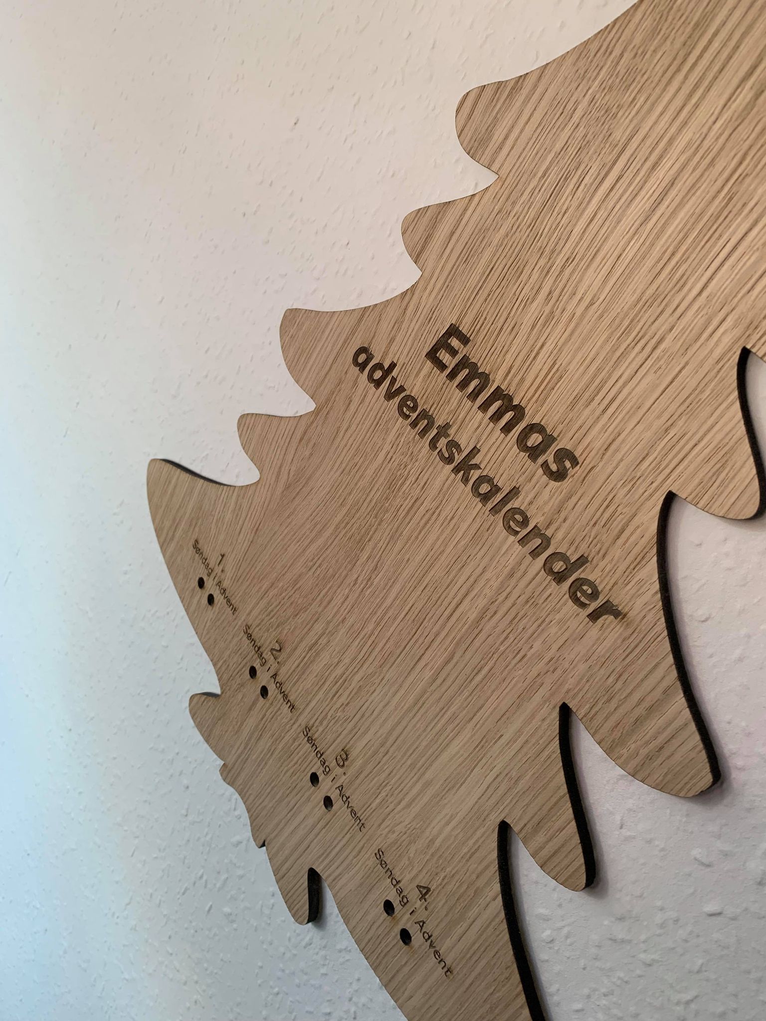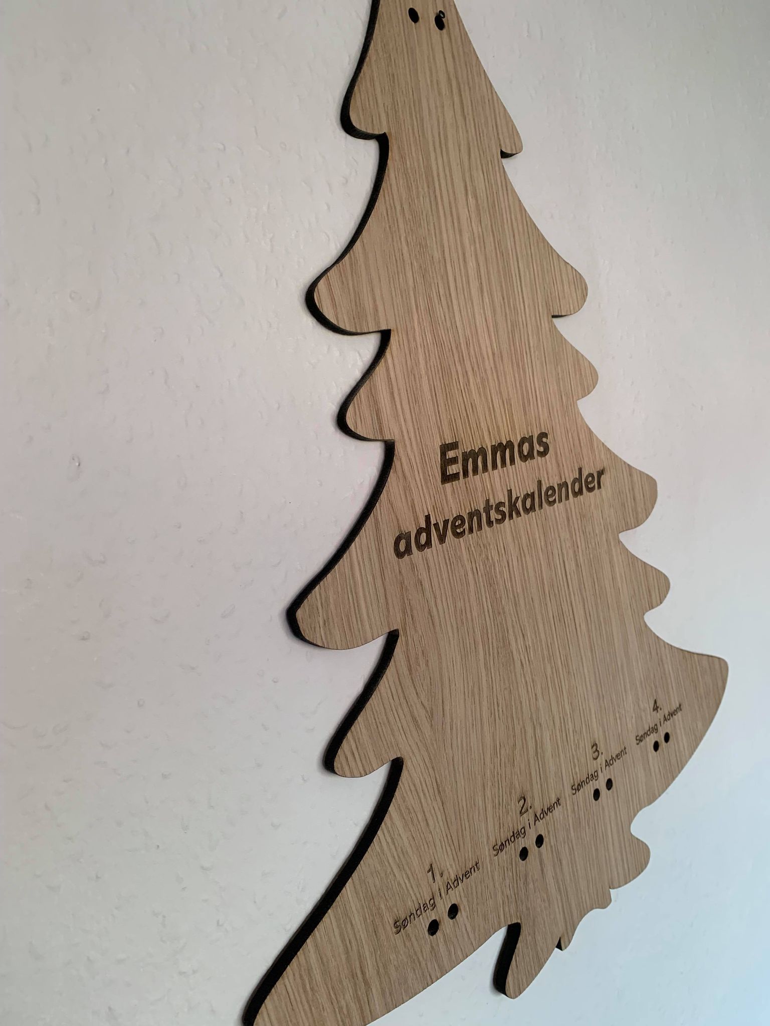 Juletræet har en tykkelse på 6 millimeter, der er udskåret i træfinér ud fra den valgte sort. Der er to huller under hver adventsdage, hvor gaverne kan hænge i en snor. (Medfølger ikke)
