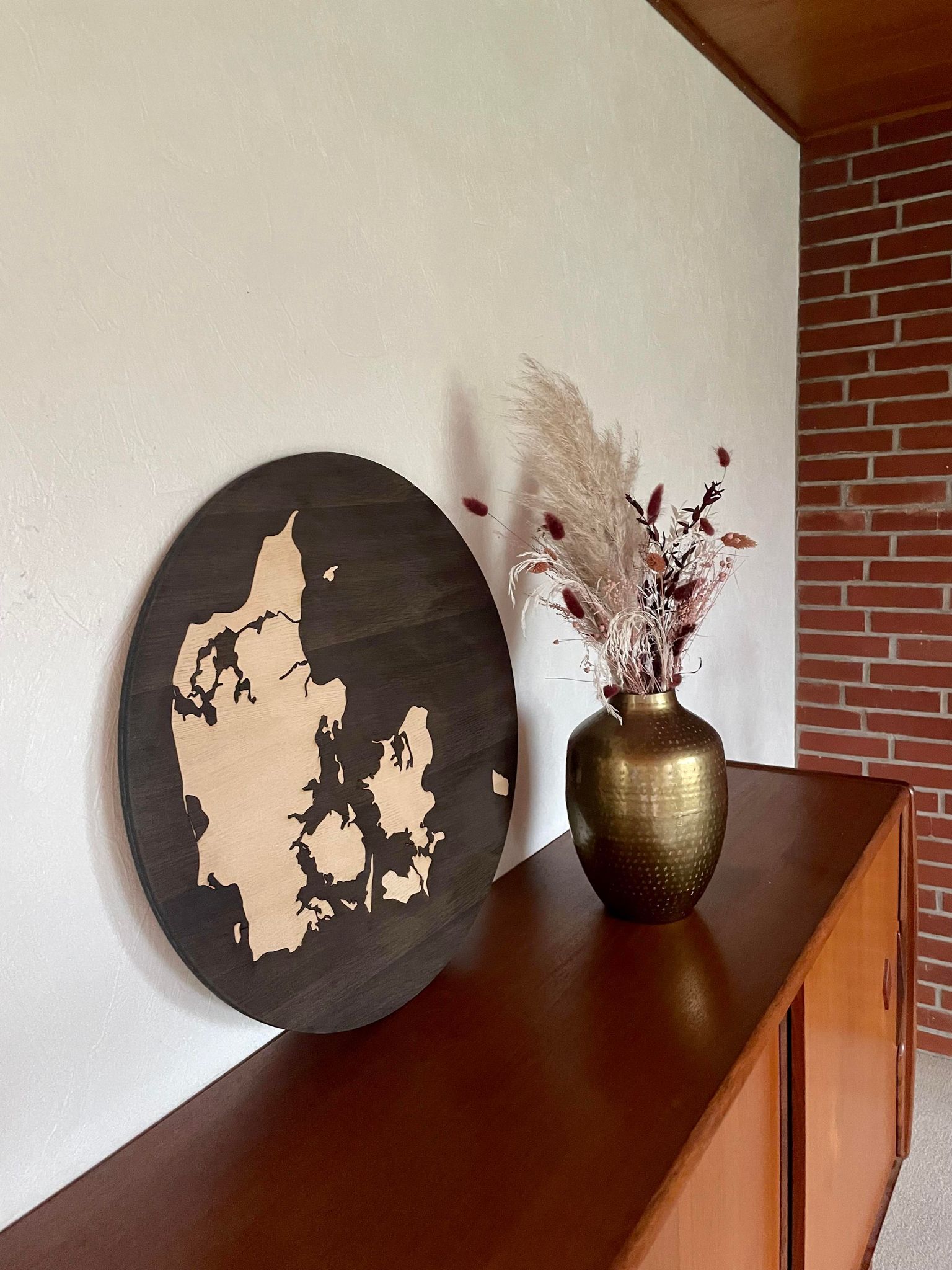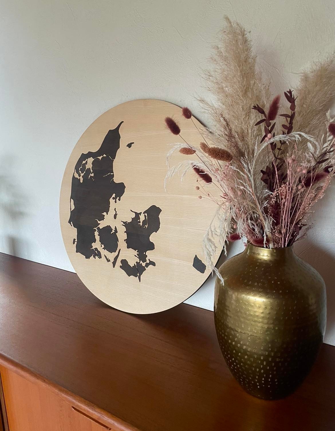 En flot vægdekoration som man passende kan hænge på væggen i hjemmet, kontoret, eller i sommerhuset. Danmarkskortet er udskåret i ask og placeret i en sort EG-ramme for at give en god kontrast